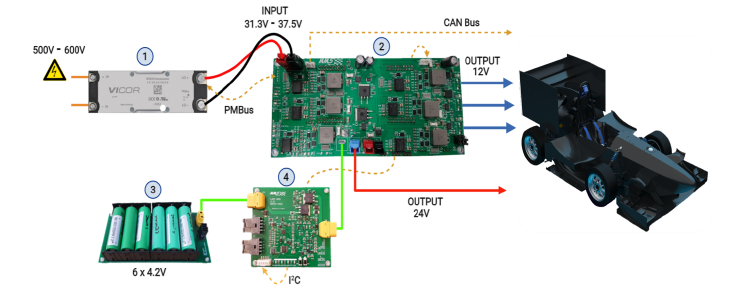 This project explores the design, manufacture, and testing of a DC-DC converter module for Monash Motorsport’s M21 electric race car. The module is designed to be able to provide 600W of power to the low voltage (LV) systems of the race car, with both 24V and 12V output rails. High voltage input is converted to an isolated, fixed ratio voltage using the Vicor BCM4414VGF4440C02, which is then converted to the required system voltages using custom DC-DC buck converter circuitry. The module is also designed to power the vehicle briefly using a lithium-ion battery pack, and then switch to DC-DC input once the high voltage (HV) battery of the vehicle has been enabled. This battery pack is then charged while the HV is in operation using custom charge circuitry.
